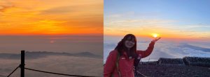 左・ご来光が顔を出した瞬間 右・ご来光に負けてない私の丸顔